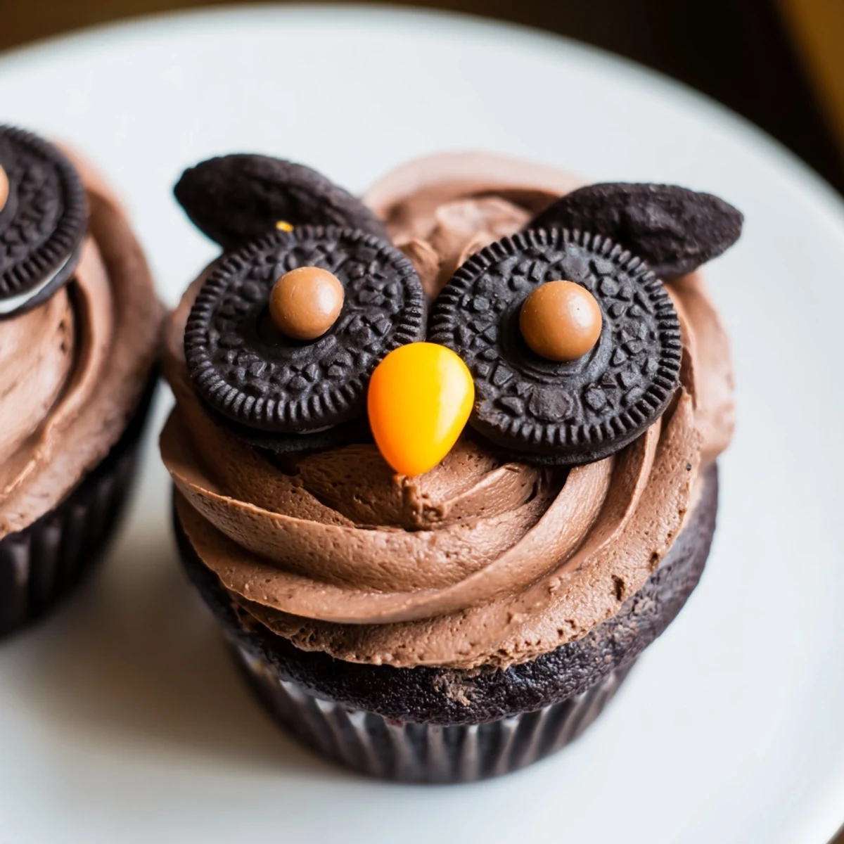 Transform simple chocolate cupcakes into whimsical owl treats that are almost too cute to eat. These adorable desserts feature rich chocolate cake topped with creamy cocoa frosting, then decorated with Oreo halves as big eyes and colorful chocolate candies for pupils and beaks. The process is straightforward: bake your favorite chocolate cupcakes, whip up a velvety buttercream frosting, and let your creativity take over during decoration. Each treat becomes a unique character with expressive eyes and charming candy features. Perfect for children's birthdays, Halloween gatherings, or anytime you want to serve something delightfully playful. The combination of moist chocolate cake, sweet cream filling, and crunchy cookie textures creates an irresistible treat that looks as impressive as it tastes.