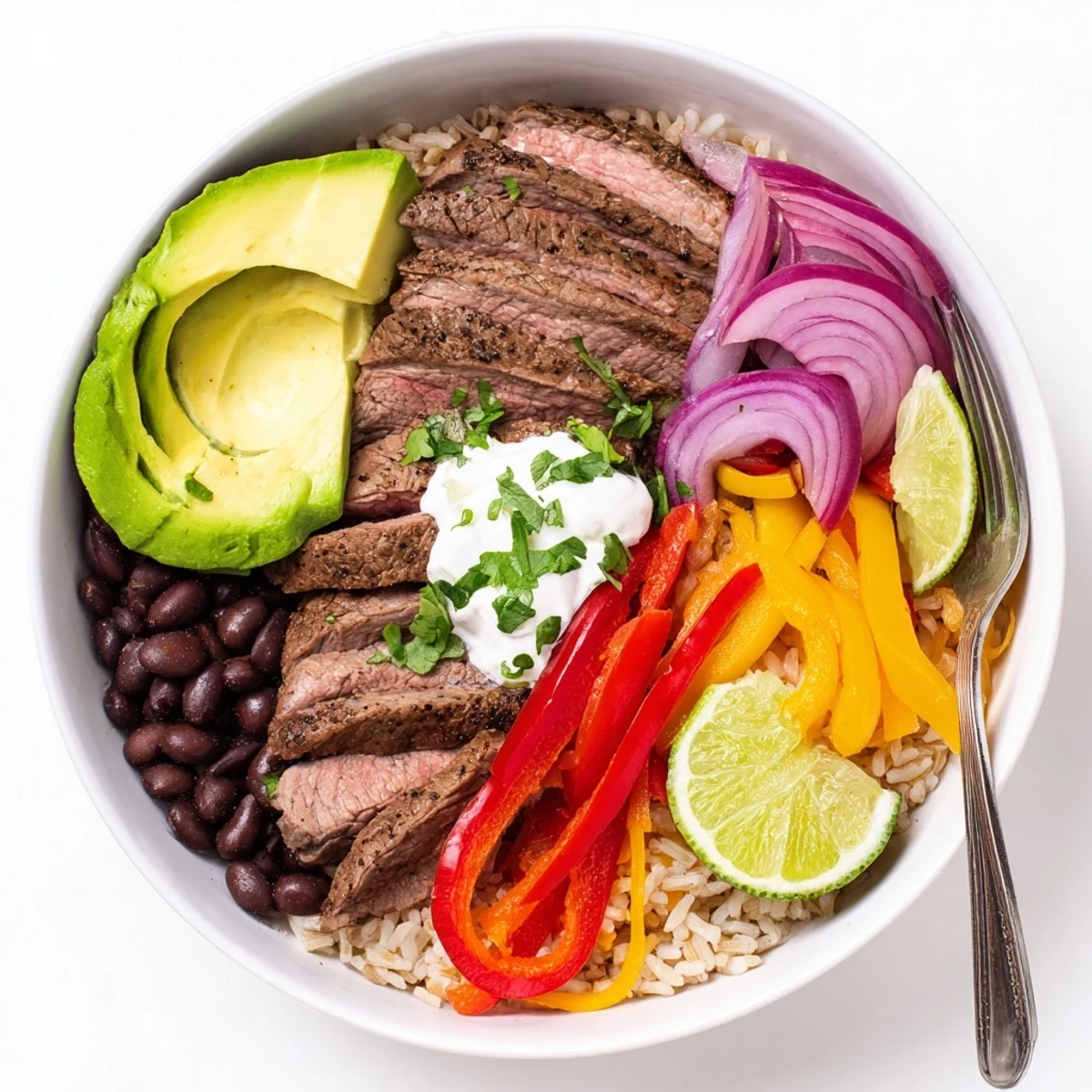 This bowl layers marinated flank steak with quickly sautéed red, yellow and green peppers and sweet red onion over warm brown rice or quinoa and seasoned black beans. Finish with sliced avocado, halved cherry tomatoes, shredded cheese, chopped cilantro and lime wedges plus a dollop of Greek yogurt. Marinate briefly for bright flavor, sear hot for caramelized edges, and swap cauliflower rice or grill the steak for variation.